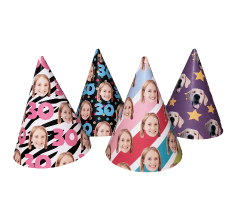 Custom printed photo party hats with your choice of pattern. Hats are printed with a professional graphics printer on durable glossy photo media with waterproof ink. Hats measure 12" x 7” tall and are shipped flat with specialty no-tie elastics so assembly is quick...- From $10.00