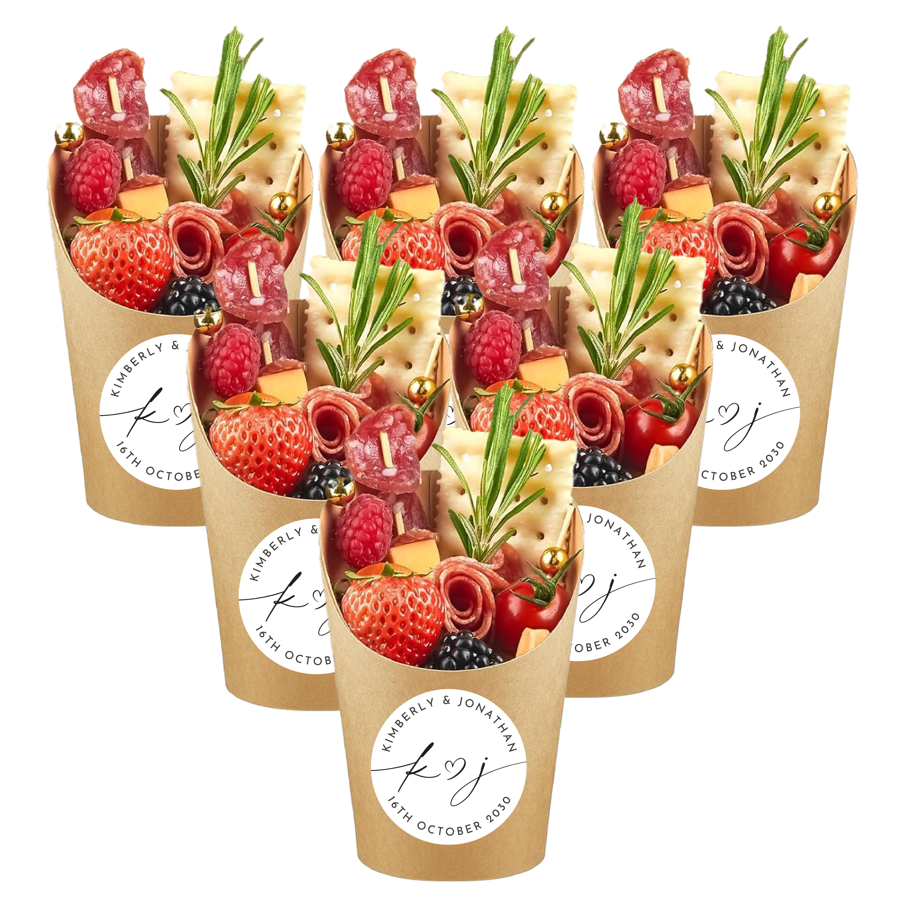 What is included in this Party Spark custom charcuterie cup listing? This listing is for decorative supplies only. You will receive stickers, picks, and optional kraft cups. No food is included.